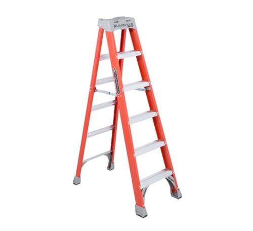This Louisville 6 foot non-conductive fiberglass step ladder has a load capacity of 300lbs, rated ANSI Type IA. This ladder is equipped with the new and innovative Raptor Top with magnet and multiple tool slots, SHOX impact absorption system, new Raptor boots with non-marring bonded tread mechanically fastened to the upper boot to create a secure slip-resistant footing, inside spreader braces, wide back braces, and double-rivet step construction. The Louisville FS1506 step ladder meets or exceeds the safety standards set by ANSI and OSHA.