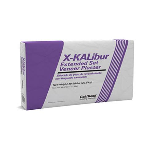 Gold Bond® X-KALibur® Extended Set Veneer Plaster is a mill-mixed veneer finish plaster for smooth trowel applications where an extended setting time is desirable. It consists of specially ground, calcined gypsum, requiring only the addition of water. Texturing grade silica sand may be added for a texture finish.