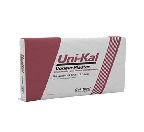 Gold Bond® Uni-Kal® Veneer Plaster is a mill-mixed veneer finish plaster for smooth and textured trowel applications. It consists of specially ground, calcined gypsum, requiring only the addition of water. Texturing grade silica sand may be added for a textured finish.