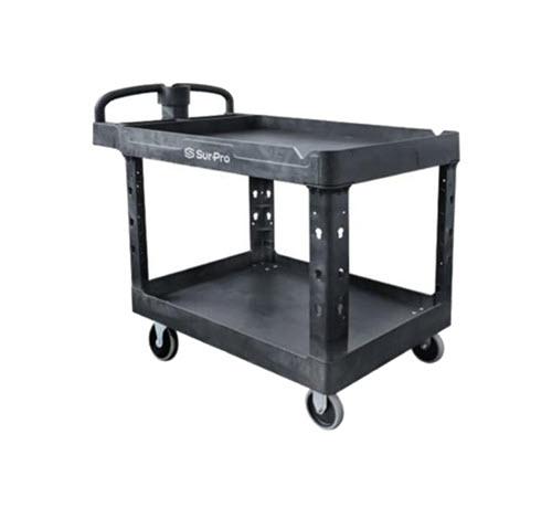 - Cart size: 44″ x 25″ x 38″, two 2.5″ deep shelves